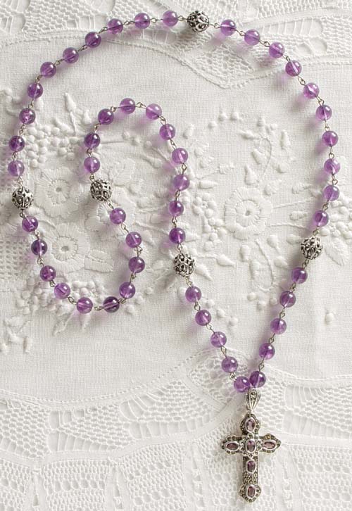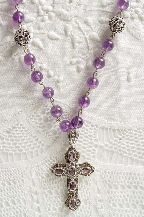 Amethyst w 2-1/4 in marcasite and amethyst inset cross - 8mm 5 decade rosary necklaces. Handcrafted with Sterling Silver. [ Box: black faux alligator box ]