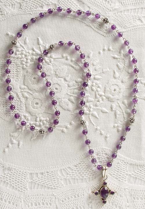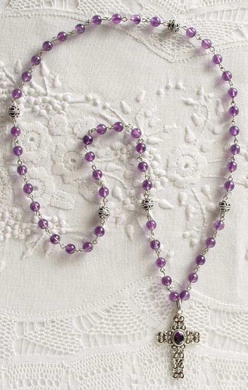 Amethyst w 1-3/4 in amethyst inset cross - 6mm 5 decade rosary necklaces. Handcrafted with Sterling Silver. [ Box: grey velvet box ]