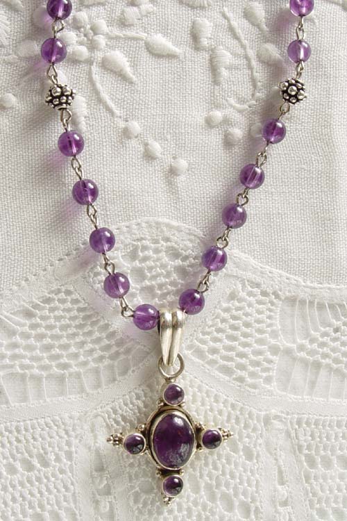 Amethyst w 1-1/2 in amethyst cabochon cross - 6mm 5 decade rosary necklaces. Handcrafted with Sterling Silver. [ Box: black faux alligator box ]